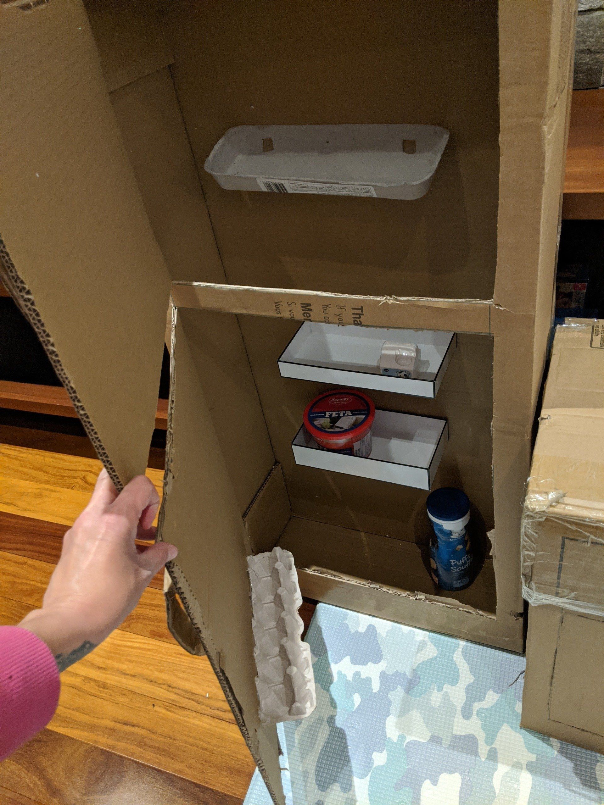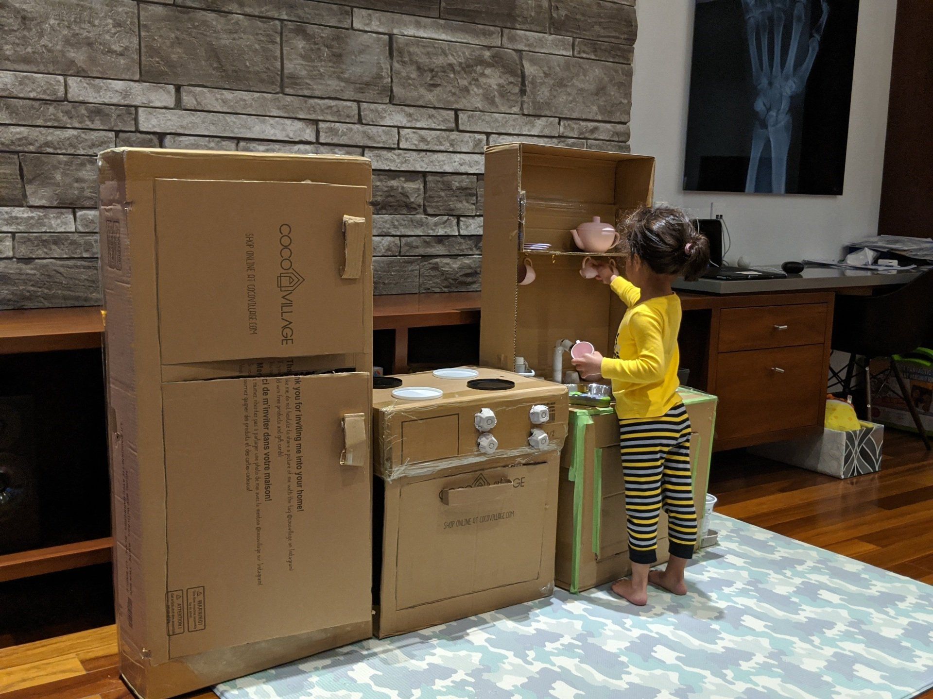With all the deliveries, we did have a lot of extra cardboard lying around. The project kept me occupied for two nights. The result kept Little occupied for about 10 minutes before she demanded a "real kitchen, not one made out of cardboard."