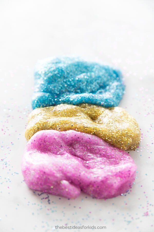 This recipe uses glue (clear or white), baking soda, and contact solution. Food colouring and glitter are optional but if there's no glitter then what's the point.